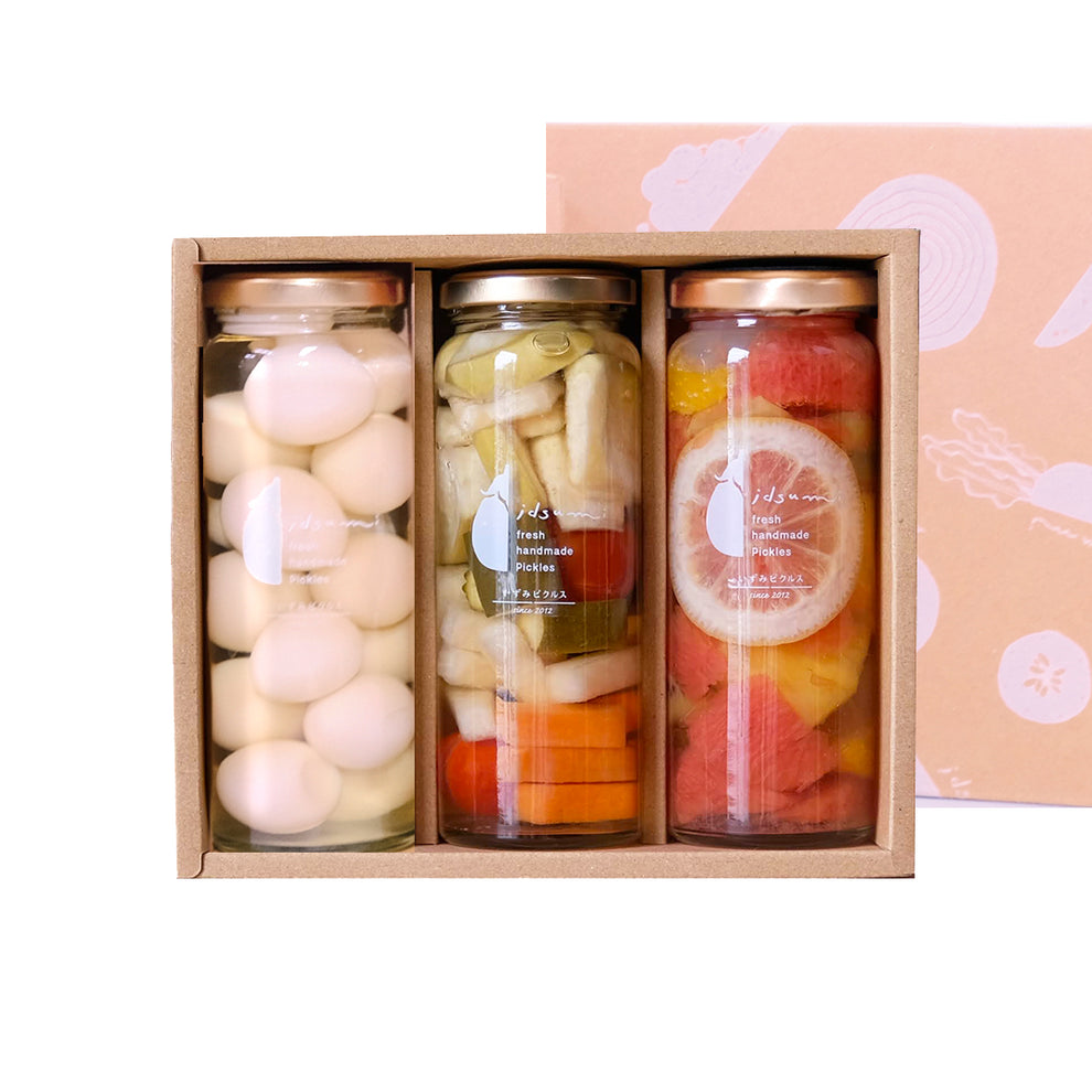 人気の定番3種の詰め合わせ。米酢と昆布だしに色とりどりの国産野菜を漬け込んだ「水ナスMIX」と「うずら卵」、リンゴ酢に6種の果実を詰め込んだ「フルーツMIX」。ツンとしすぎない、優しい酸味で、そのままでもアレンジしても!