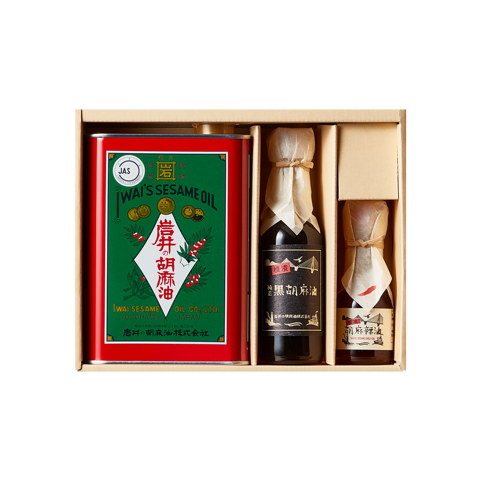 創業160年を超える老舗「岩井の胡麻油」のギフトセット。焙煎した胡麻を圧搾し、香り豊かに仕上げています。揚げ物や炒め物に便利な青缶、コク深くスッキリした味わいの黒胡麻油、唐辛子をじっくり煮出した辣油の3点詰め合わせ。