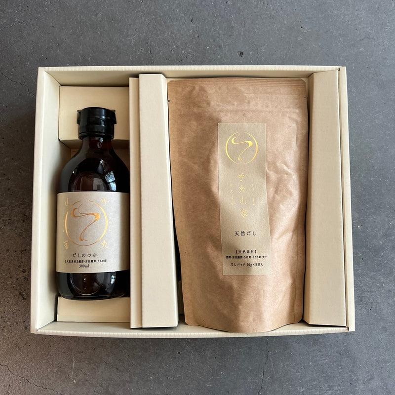 徳川家も愛用した名古屋最古の料亭・河文がプロデュースする専門店「手火山家(てびやまや)」のギフトセット。5種の節と昆布、椎茸をブレンドしただしパックと、九重本みりんをあわせただしつゆの詰め合わせ。天然素材使用で、化学調味料は無添加。健康への気遣いが伝わる贈り物です。