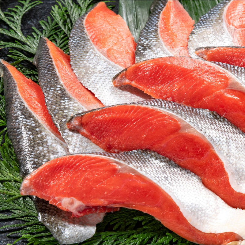 北海道・小樽の海鮮問屋「飯坂冨士商店」の切り身詰め合わせ。世界のサケマス生産量のうち、わずか4%の天然紅鮭を1切100gの贅沢な厚切りに。凝縮された強い旨味、ほどよく脂ののった、しっとりした舌触りが特徴です。塩分控えめの甘口。