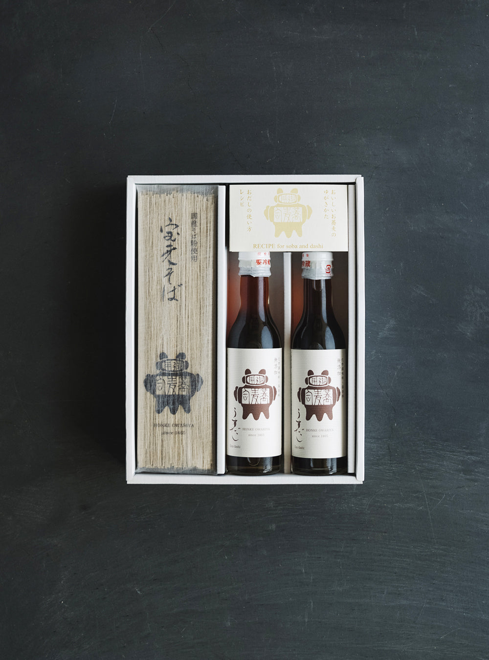 尾張の菓子屋として創業し、江戸中期には京都の禅寺に蕎麦を納めた「本家尾張屋」。宮内庁御用達としても知られる名店です。本店の蕎麦と出汁をご家庭でも楽しめる詰め合わせ。北海道産の薫り高い蕎麦粉、利尻昆布や潤目、鯖節など、吟味された素材から生まれる美味しさを堪能。