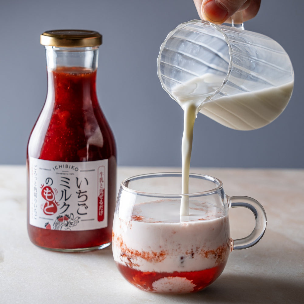 つぶした果肉に砂糖をまぶし牛乳をかける…いちごとミルクの組み合わせは永遠の定番。とはいえ、フレッシュで酸味強めの果実を入手できるのは限られた旬の時期だけ。「ICHIBIKO」の「いちごミルクのもと」があれば、いつでも好きな時に楽しめます。