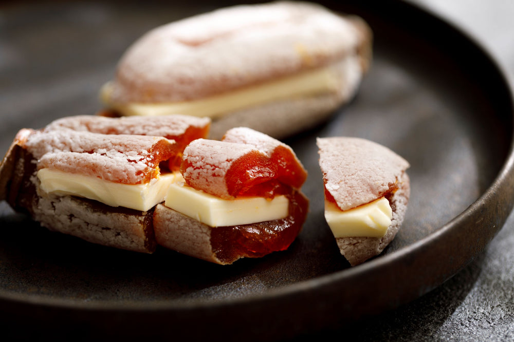 原料の柿は、地元で栽培される稀少な「最勝柿」。能登特有の海陸風で乾燥させ、飴色に仕上げます。まるでおもちのような柔らかな食感と濃厚な甘みが特徴。バターをたっぷりサンドした「能登柿之助 バターの乱」は、干し柿独特の風味にコクが加わり、極上の味わいに。