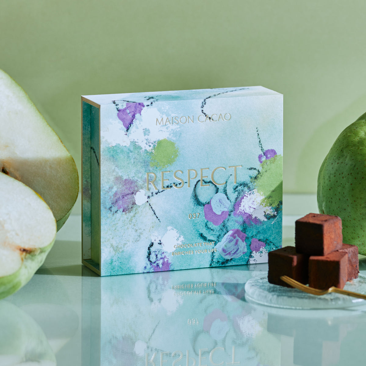 目上の方へのギフトに最適な「RESPECT(尊敬)」。収穫後。40日かけて追熟させる幻の洋梨”ル・レクチェ”に、ビターチョコレートをブレンド。芳醇な香りとリッチな口どけに、うっとり。