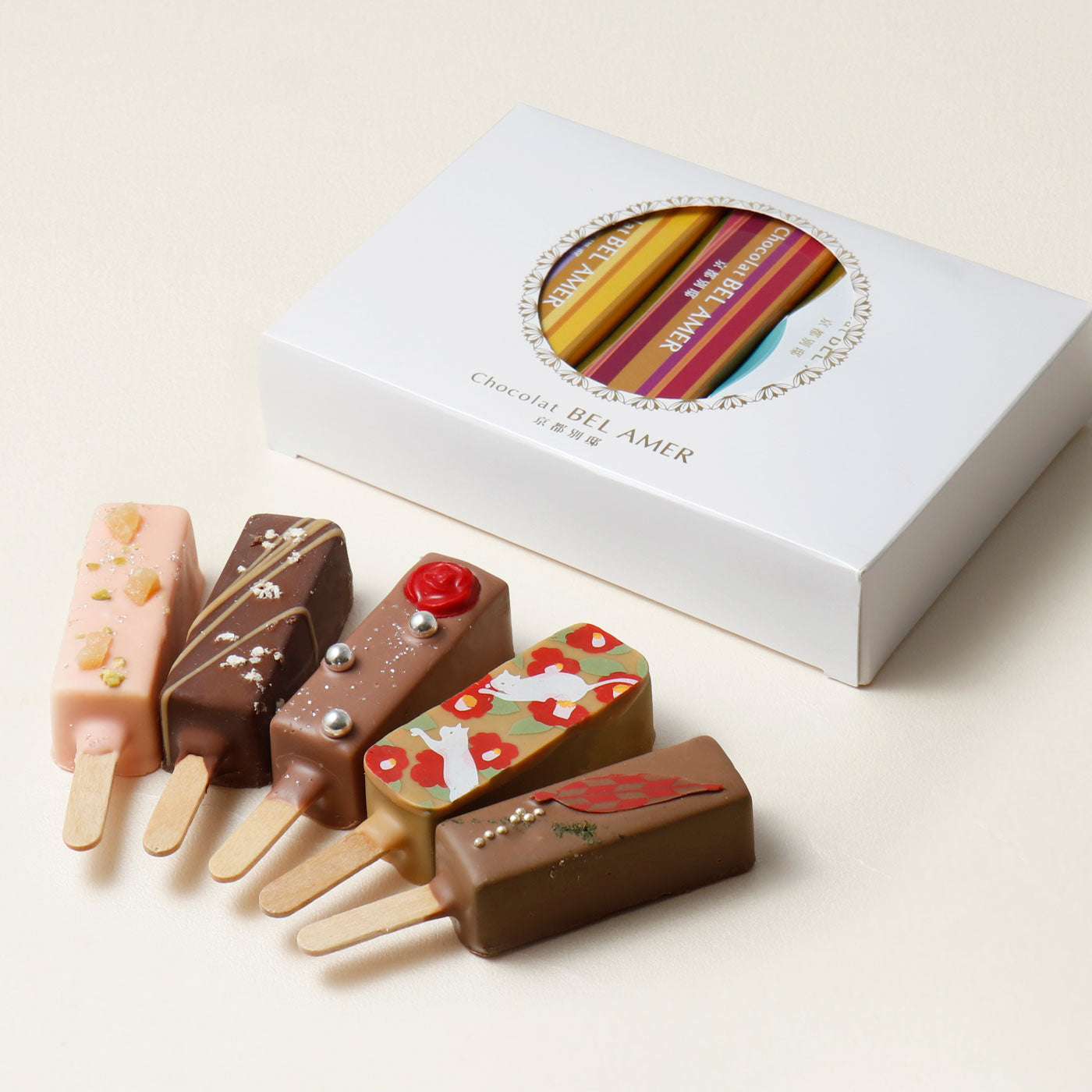 「Chocolat BER AMER 京都別邸」で人気のスティックショコラ。アートのようなトッピングに、ラッピングを開けた瞬間思わずため息が出そう。ハニーローズや和紅茶といった味も珍しくて話題になりますね。おしゃれで写真映えするチョコレートで、休憩時間にちょっとした女子会を楽しんで。