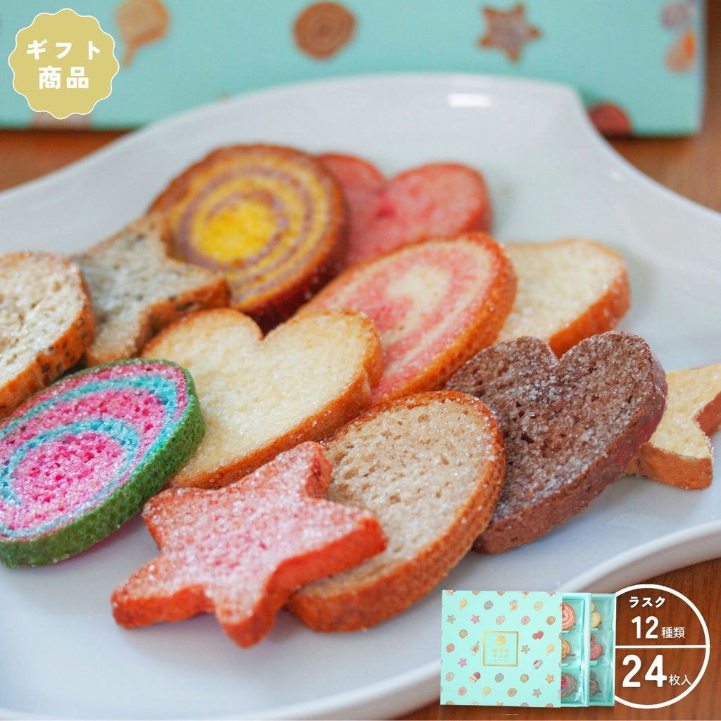 可愛らしいデザインのラスク。スイートポテトや苺ショートケーキなど、バラエティ豊かな味が楽しい。ラスクとは思えないポップな色使いとキュートなフォルムに、もらった人の心も明るくなりそう。個包装の24枚入りなので、人数の多いオフィスでばらまき用にもぴったりですね。
