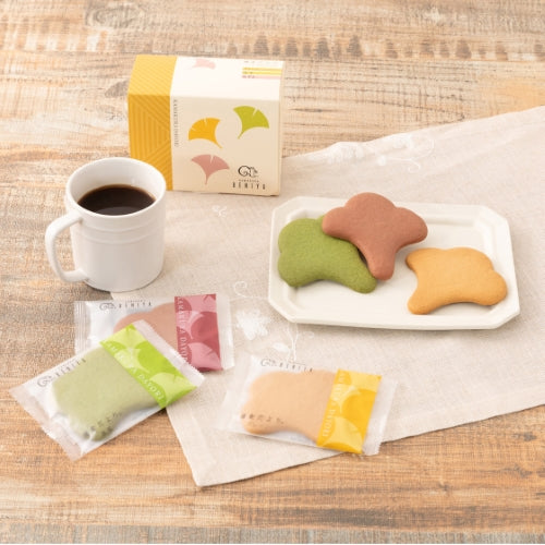 かつて鶴岡八幡宮の象徴だった大銀杏の葉をモチーフにした「鎌倉だより」。プレーン、小豆、抹茶3種のフレーバーのサブレの詰め合わせ。軽やかな歯ごたえで、小麦やバターの香りを感じる素朴な味わい。