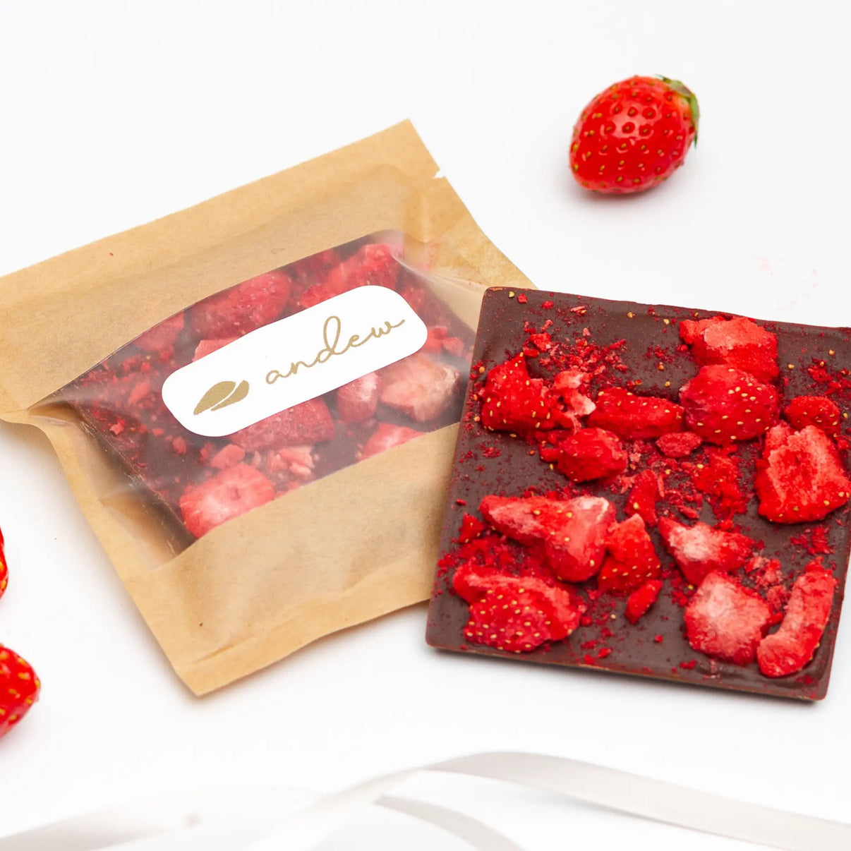 フリーズドライのいちごを散りばめたチョコレート。現役医師が誰の体にも優しく、美味しいチョコレートを作りたいという思いで立ち上げたブランド「andew」の人気商品です。無添加のいちごと栄養満点のチョコレートは嬉しいギフトに。いちごの鮮やかな赤いカラーで、素敵なバレンタインの写真が残せそう。
