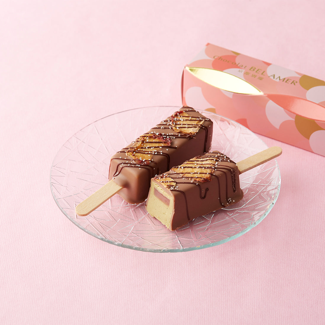 「ベルアメール 京都別邸」の棒つきチョコレート。あまおういちごのピューレを贅沢に使用したキャラメルと、ピスタチオのホワイトチョコが絶妙な甘味のハーモニーを奏でます。500円台の手頃な価格は、バレンタインのプチギフトにぴったり!