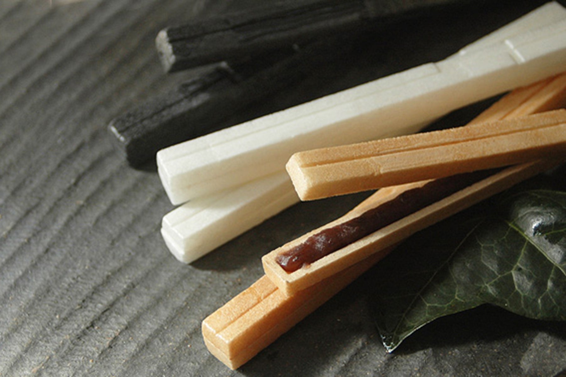 細長い形状が個性的な手詰め最中。国産の高級糯米を使った種は、生地を焦がさないように焼き上げた白、竹炭を使った黒の3色。餡は大納言小豆で作る定番のあんこの他に、黒胡麻や落花生バター、杏子など、多彩な素材を使っています。パッケージもモダンでおしゃれ。
