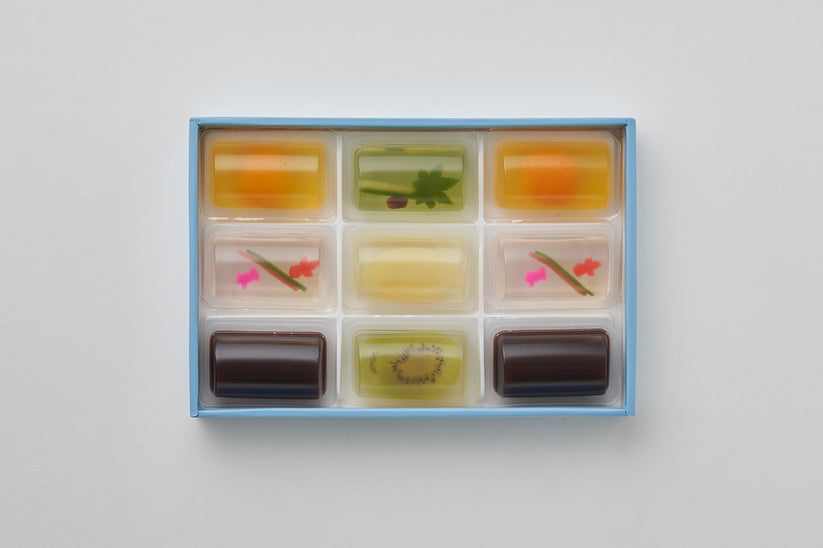 まるで宝石のような一口菓「ゆうたま」。北川柚子、有機すだち、阿波山桃など、四国の特産果実と寒天をあわせた錦玉。封を開けると広がる爽やかな香り。弾むような食感と甘酸っぱい風味。定番5種の他、季節限定品もおすすめ。