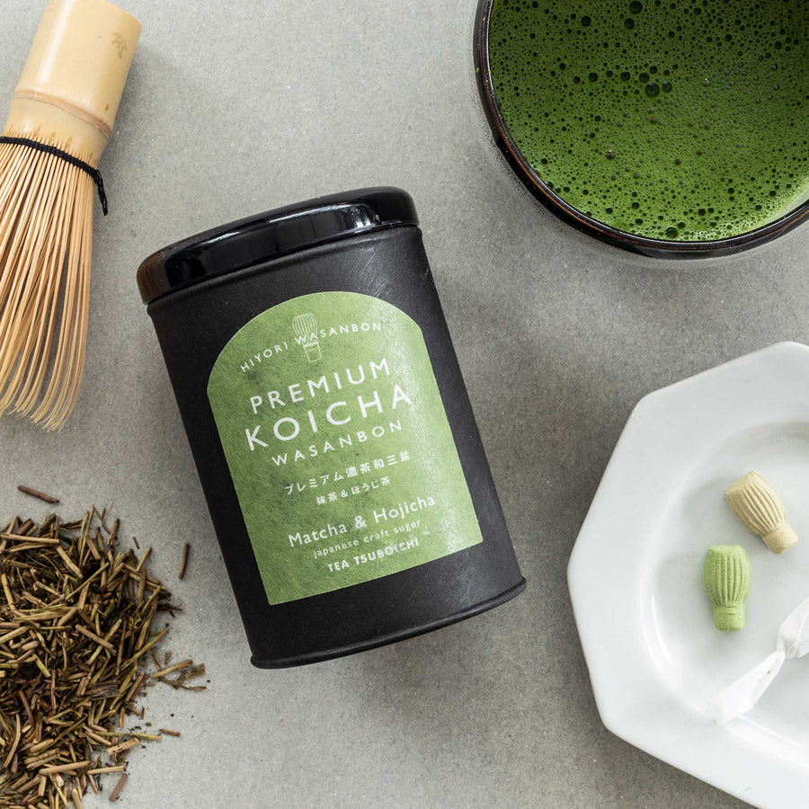大阪・堺の老舗「つぼ市製茶本舗」とのコラボ商品「プレミアム濃茶和三盆」。和三盆の上品な甘さに合う抹茶とほうじ茶を選定。茶せんの形がかわいい風味豊かな落雁に仕立てています。